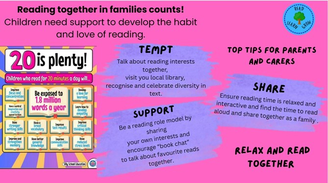 We provide our children a wide range of opportunities for them to enjoy reading, chat informally about books that they enjoy and make recommendations to others. Teaching staff and support staff undertake ongoing professional development which ensures they are knowledgeable about contemporary children's literature. This allows them to engage with children in book talk and with personal book recommendations.